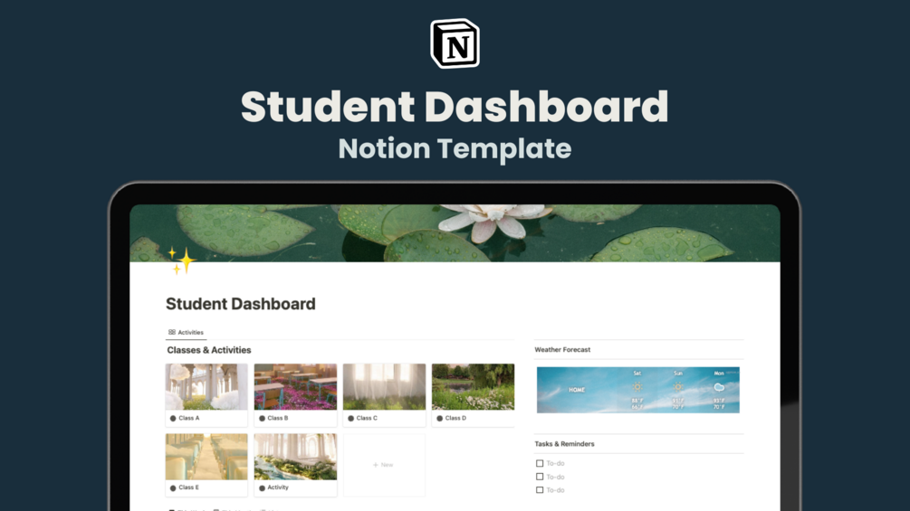 This Notion template is specifically designed for students! On your main dashboard, there is a page for each class and activity, plus a minimalist to-do list and a weather widget. Keep track of class notes, reading notes, deadlines, and due dates all on one streamlined, automated calendar. Notion is available to access via internet browser, Desktop App, or Mobile App.